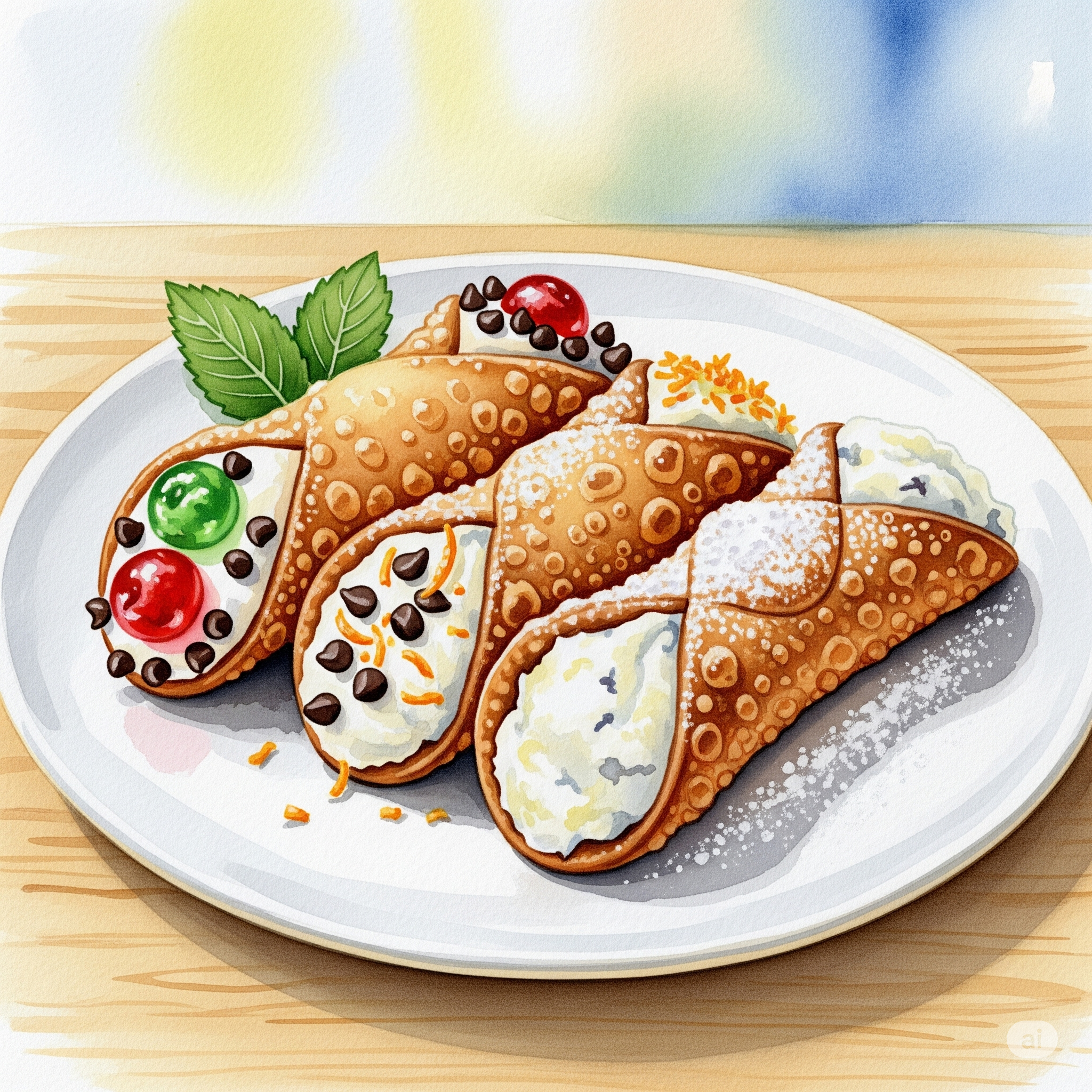Crispy pastry tubes filled with ricotta cream, chocolate chips, or candied fruit.