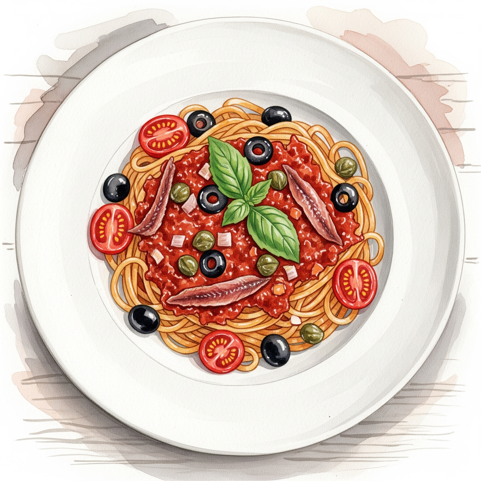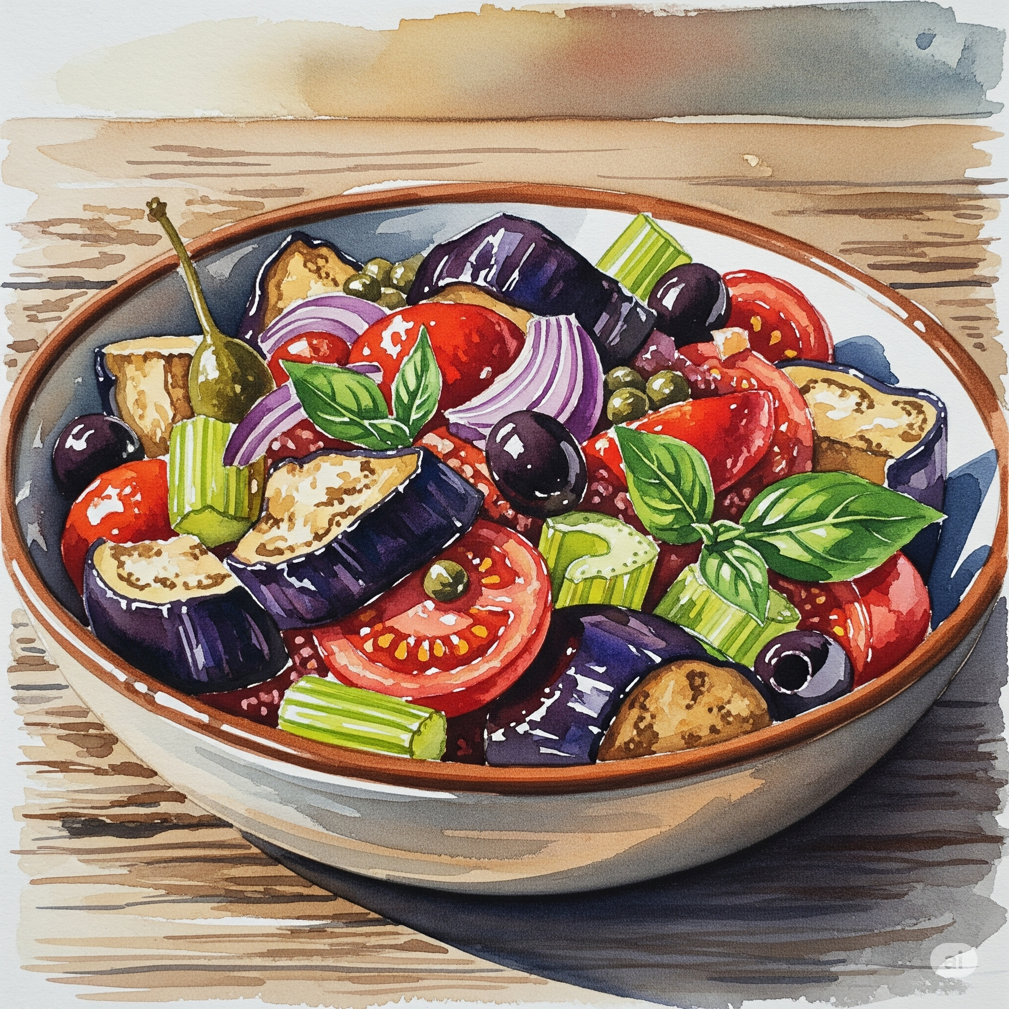 Eggplant, capers, olives, and tomatoes with a sweet-sour balance.