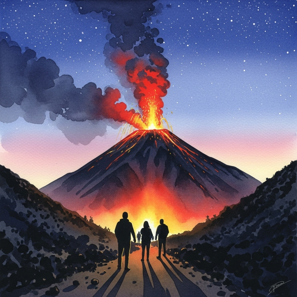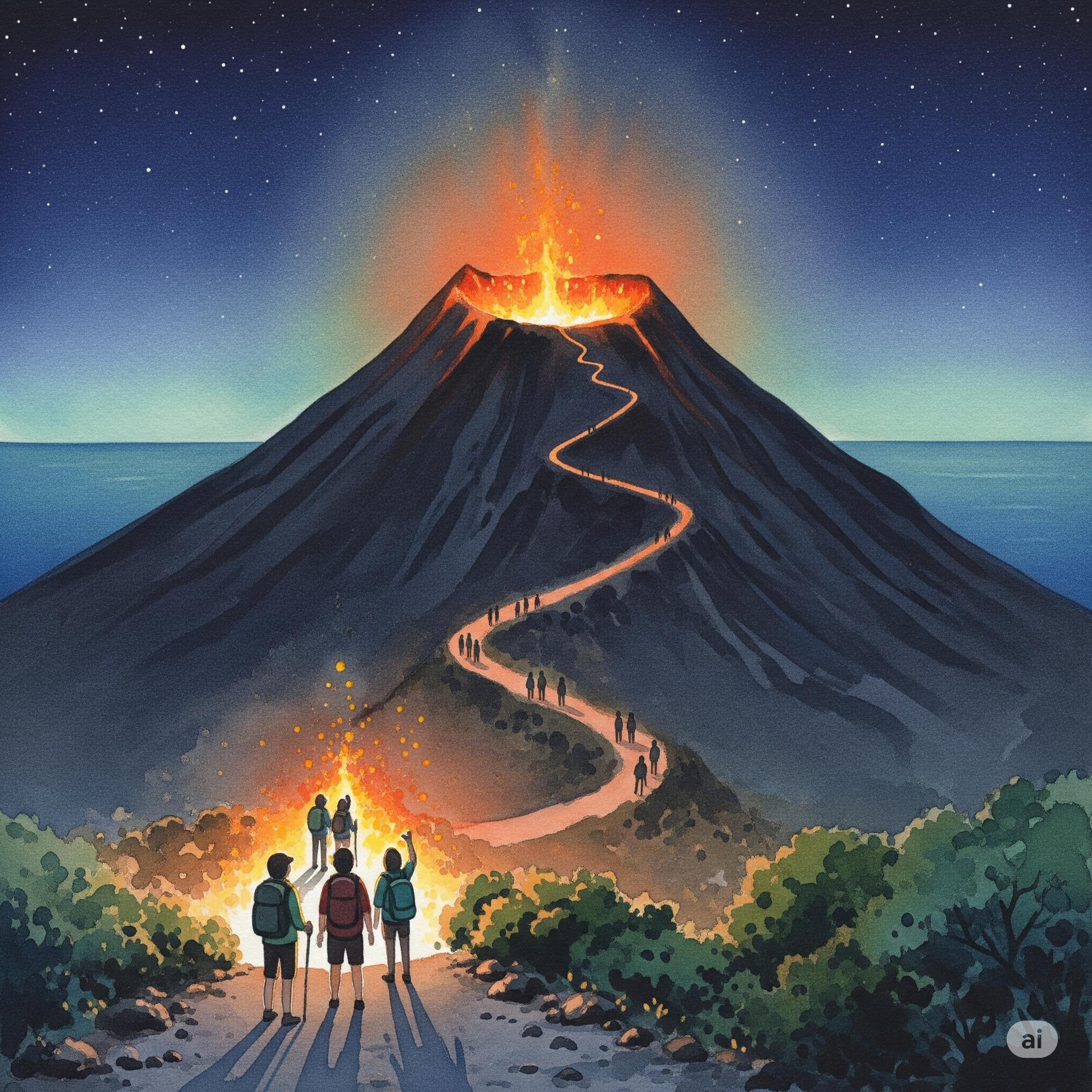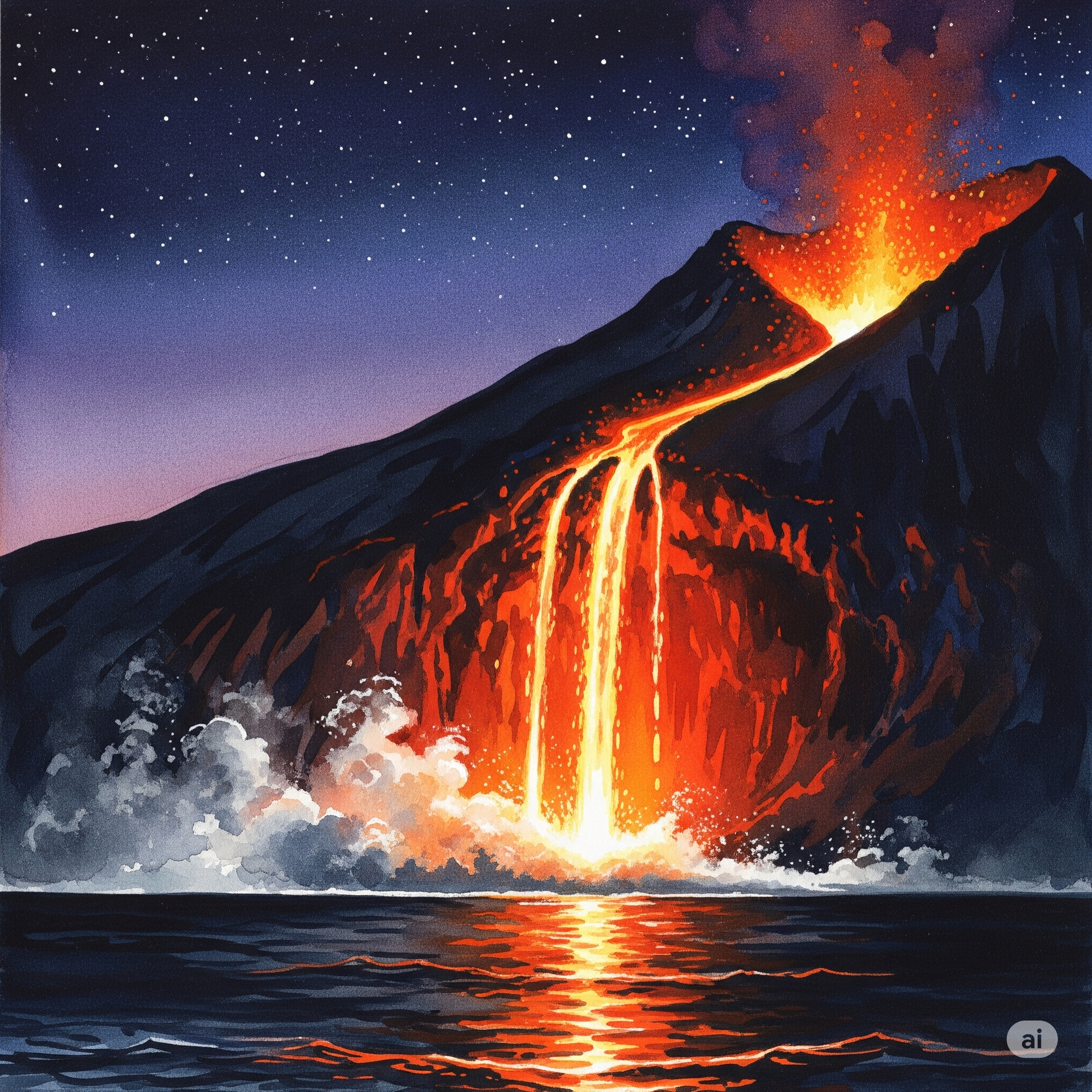 Watch streams of lava rolling down the volcano’s slope into the sea.