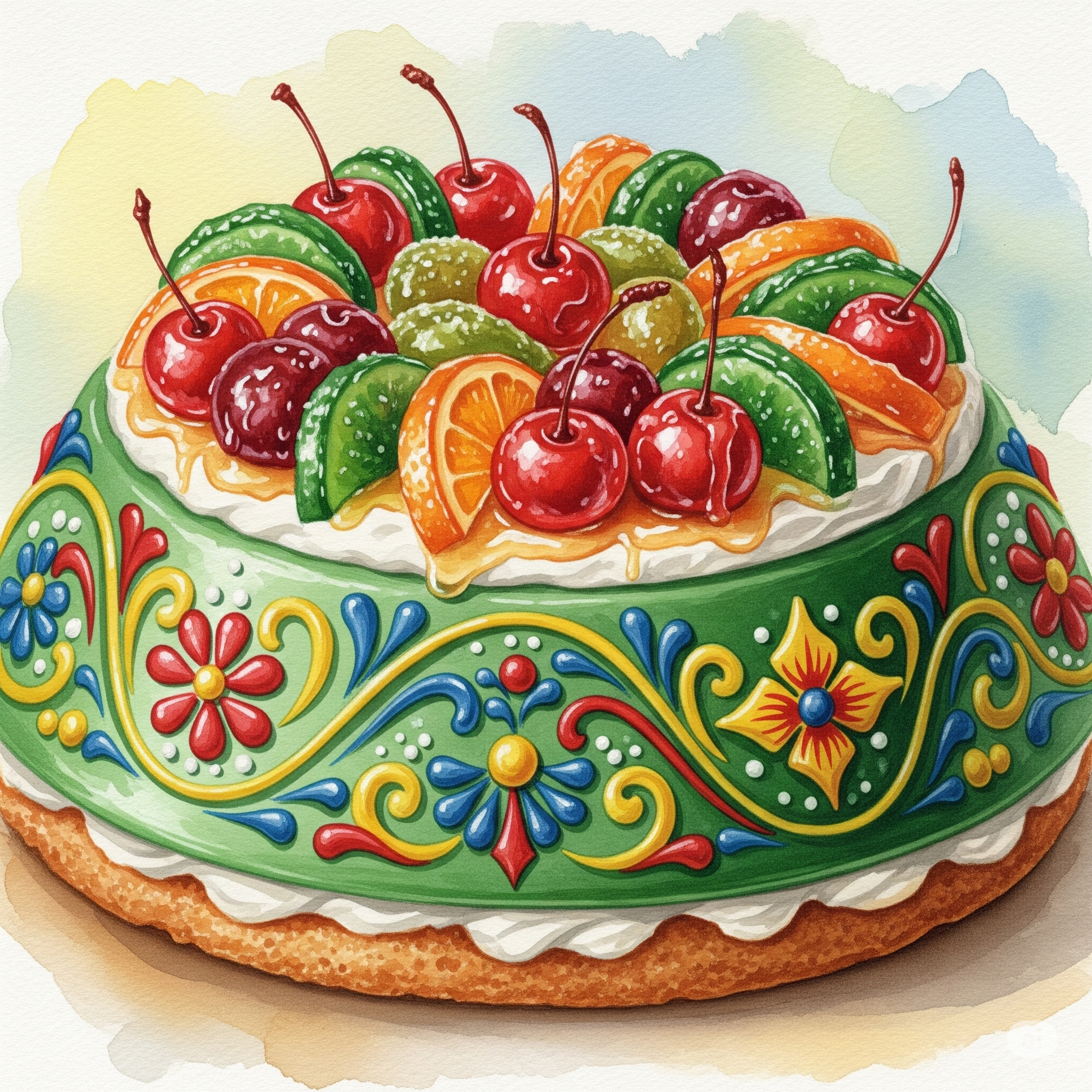 Sponge cake layered with ricotta, candied fruit, and marzipan.